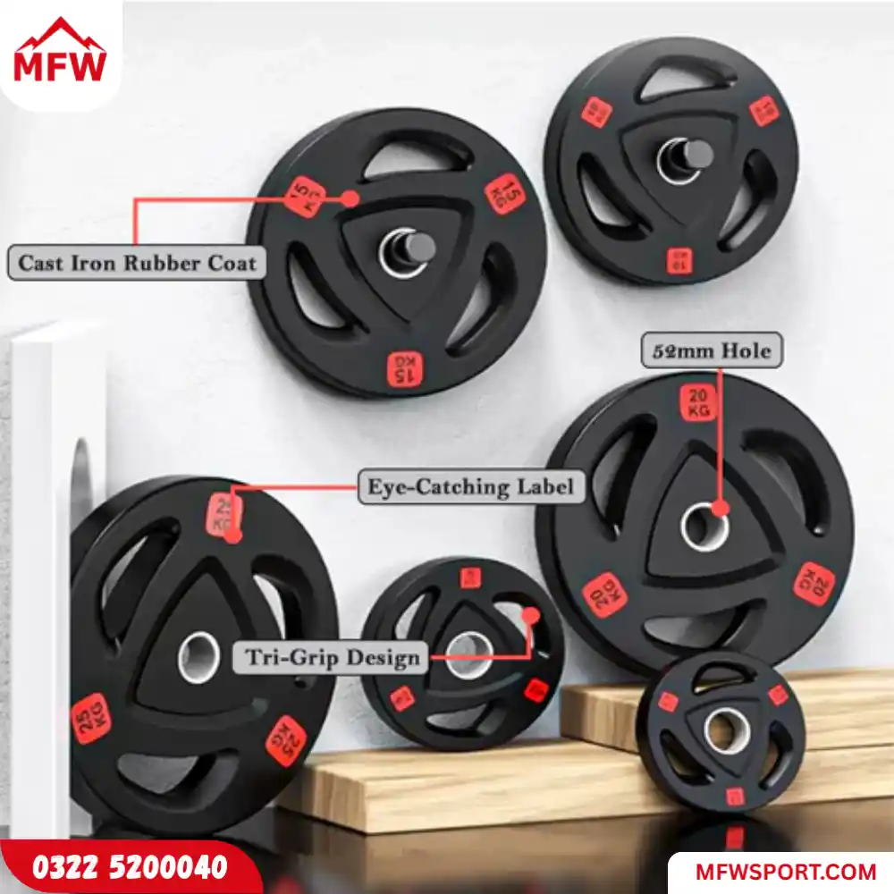 Heavy-duty rubber-coated Olympic weight plates with tri-grip handles, available from 2.5kg to 20kg—ideal for home and commercial strength training.